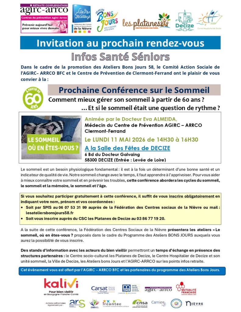 Le Centre-socio-culturel vous informe de la prochaine conférence sur le sommeil dédié aux séniors le 11 mai 2026 de 14h30 à 16h30 à la salle des Fêtes de Decize